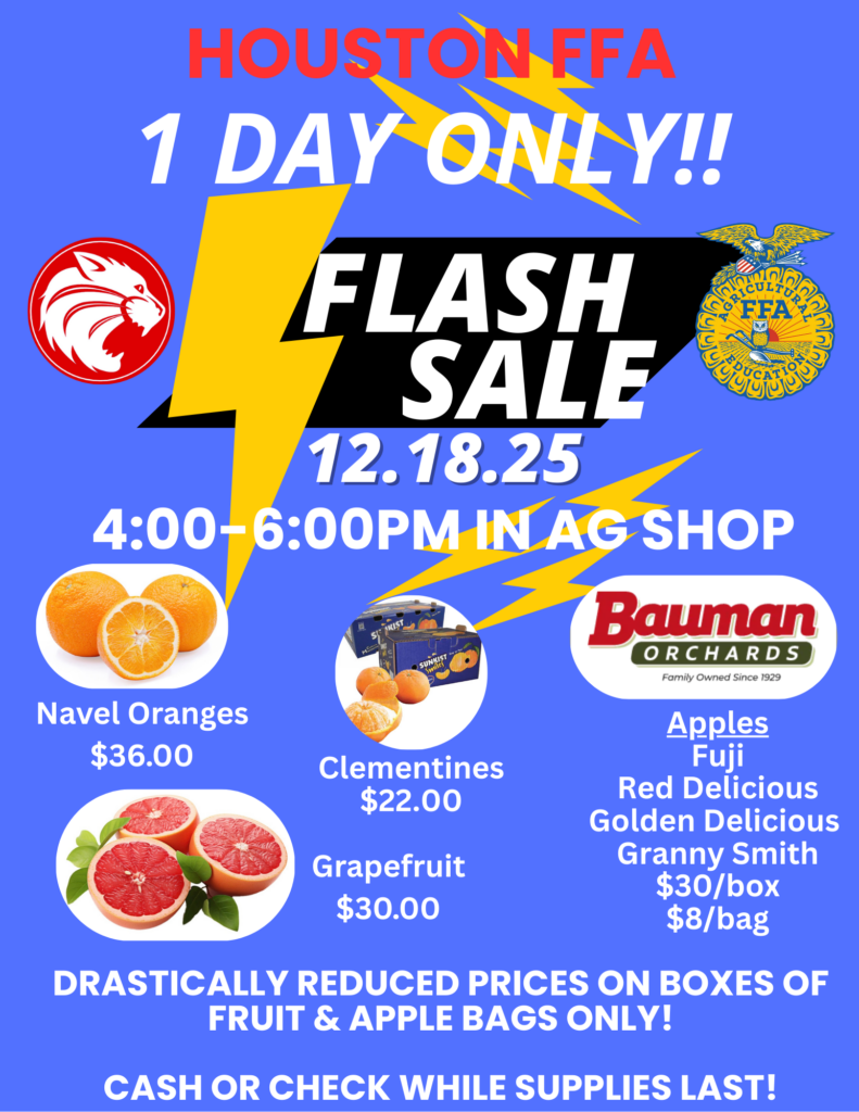 The FFA is having a flash fruit sale to sell the excess fruit before break this Thursday December 18 from 4-6 PM in the ag shop. Prices on the flyer are for full boxes only or bags of apples.