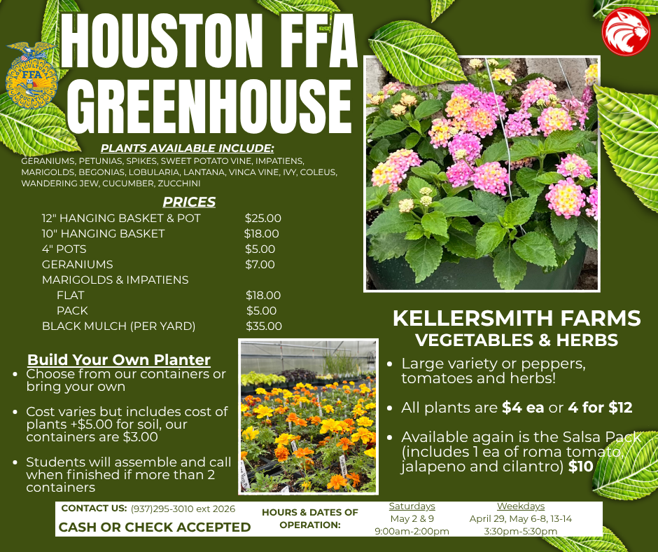 The FFA Greenhouse will be open on the following dates from 3:30-5:30 PM April 29th, and May 6th, 7th, and 8th and from 9:00 AM-2:00 PM on Saturday May 2nd and May 9th.